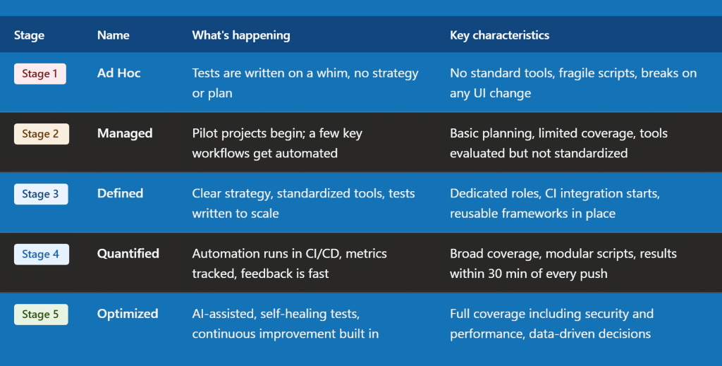 It maps how far your organization has moved from scattered, fragile scripts toward a predictable, integrated, and self‑improving automation system that can keep pace with CI/CD and product‑team velocity.