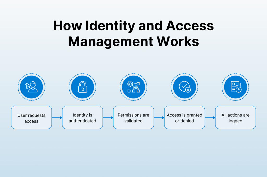 Identity and Access Management (IAM) manages user identities, company resources, and the allocation of access and authority in the digital system to ensure that the right user handles the right data or resource. IAM offers several important benefits: