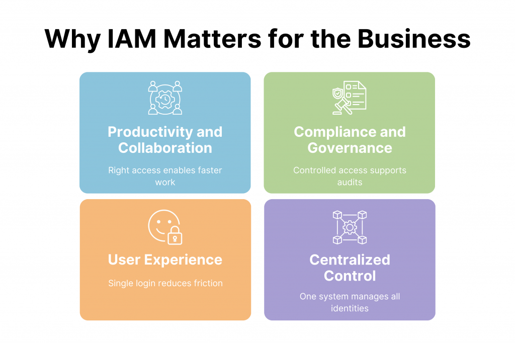 - IAM improves productivity and compliance at the same time by giving the right people the right access only when needed.
