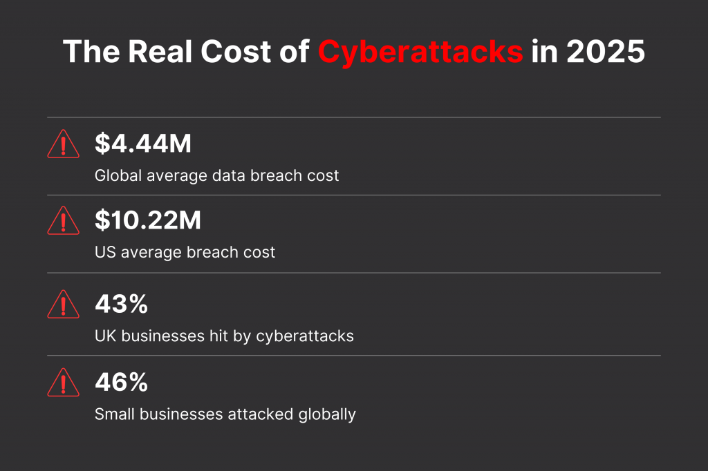 - Cyber-attacks are very common now. In 2025, a single data breach cost businesses about $4.44 million worldwide and $10.22 million in the US. In the UK, 43% of companies were hit by cyber-attacks.