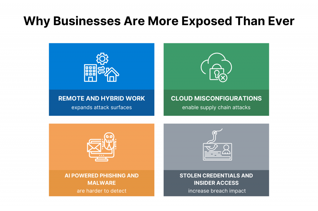- Remote and Hybrid Work Models: With 61% of SMBs targeted, distributed teams expand attack surfaces via unsecured home networks and VPNs. This contributes to 75% of small businesses enduring at least one attack annually.