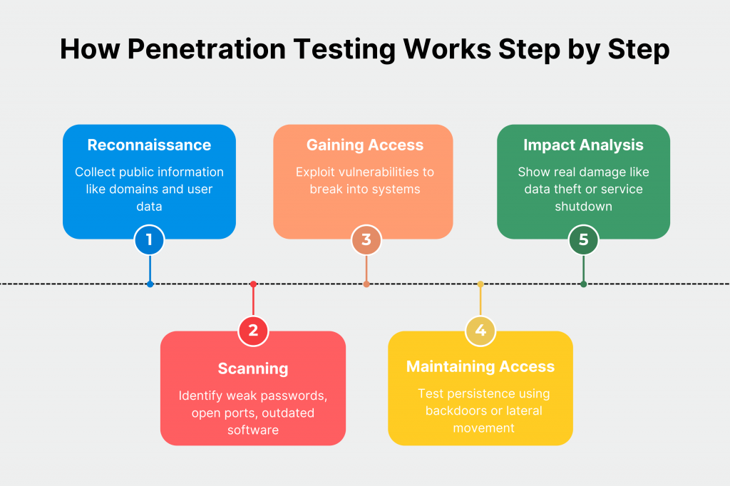 As mentioned earlier, penetration testing follows a clear step-by-step process to act like real hackers and find weak spots in your systems before the bad guys do.