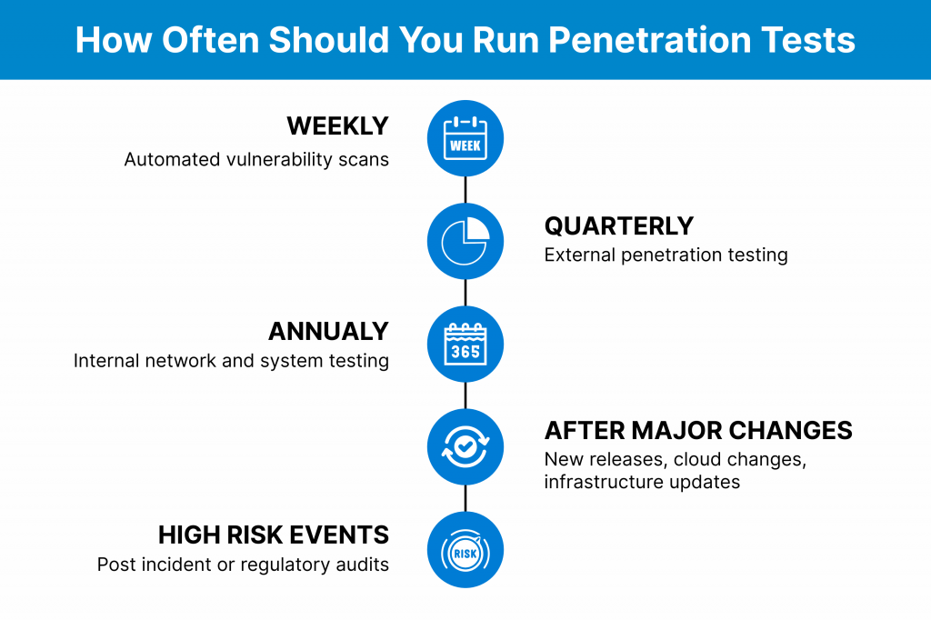 Deciding how often to run penetration tests depends on your business risks, the rules you must follow, and recent changes.