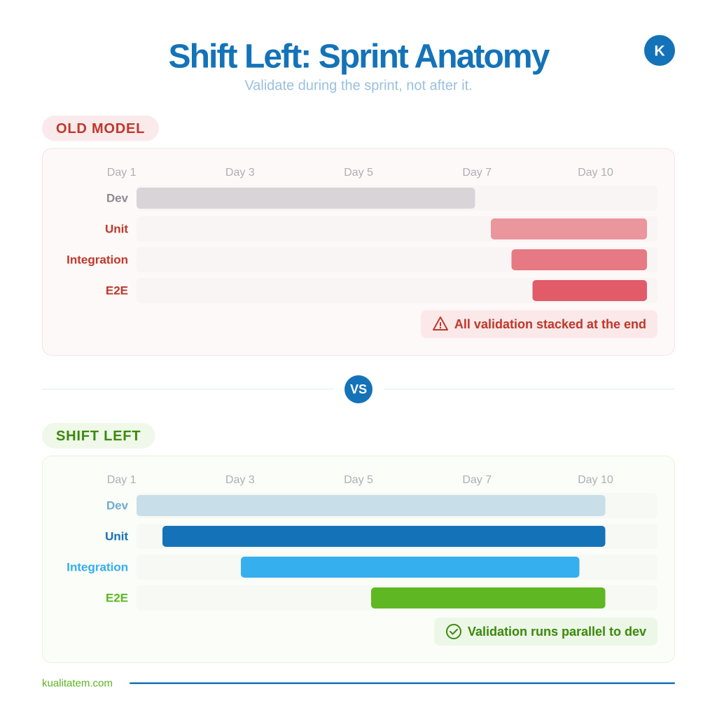Kualitatem has been building this model for over 16 years, operating at TMMi Level 5 with ISO 27001 compliance. Across Fortune 500 banking platforms, government systems, and high-growth SaaS products, clients implementing lifecycle-wide validation report 300% ROI on their quality investment, fewer repeated production failures, and release cycles that are both faster and safer. When validation is distributed instead of concentrated, the quality function stops being a bottleneck and becomes the reason releases hold up under real-world load.