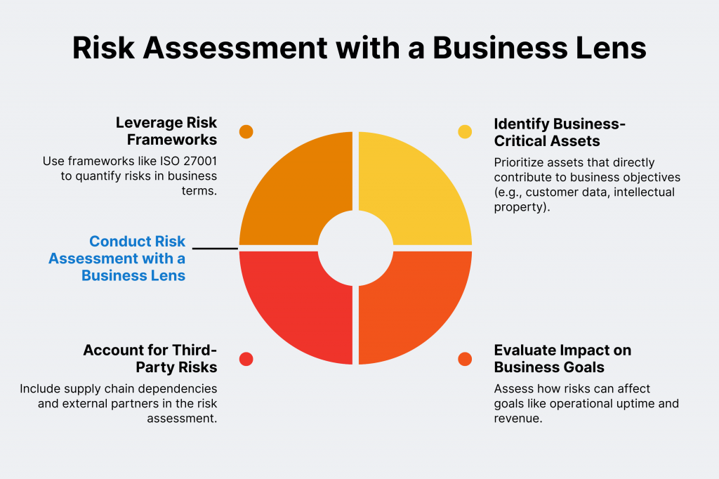 To do it, first assess risks based on their potential impact on business goals. i.e., operational downtime and loss of intellectual property. Then, prioritize assets and processes that are most important to achieving required business outcomes. Once that’s done, it’s time to consider third-party risks. They can be supply chain dependencies and regulatory obligations.